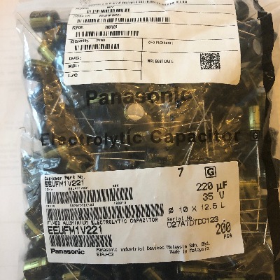 This pack includes six Panasonic FM Series 220µF 35V Electrolytic Capacitors. With low ESR, high ripple current capacity (950mA), and a lifespan of up to 5000 hours at 105°C, these 10×12.5mm radial capacitors are designed for filtering, decoupling, audio, and LED applications in 12V–30V systems. Pacific Custom Engineering provides authentic Panasonic components for repair or circuit use.